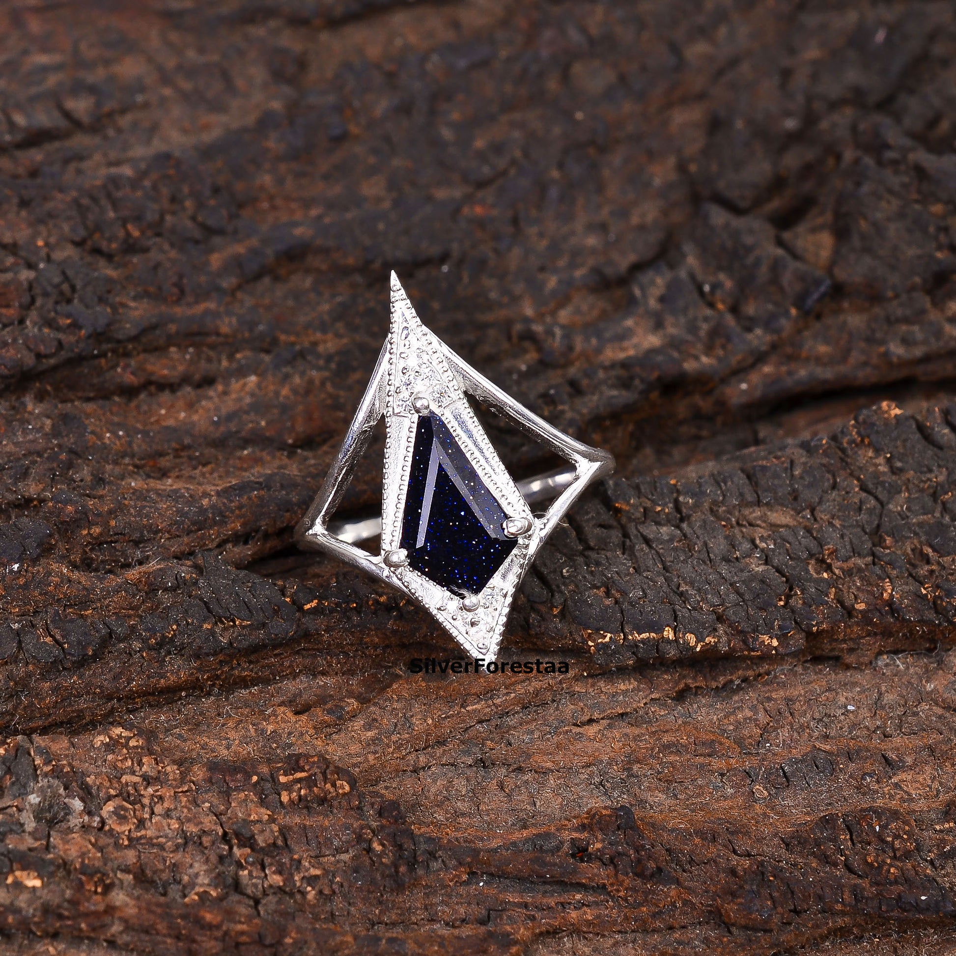 Galaxy Blue Sandstone Ring 925 Sterling Silver Kite Shape Ring/Blue Sunstone Ring Wedding Jewelry for Women Blue Galaxy Outer Space Ring