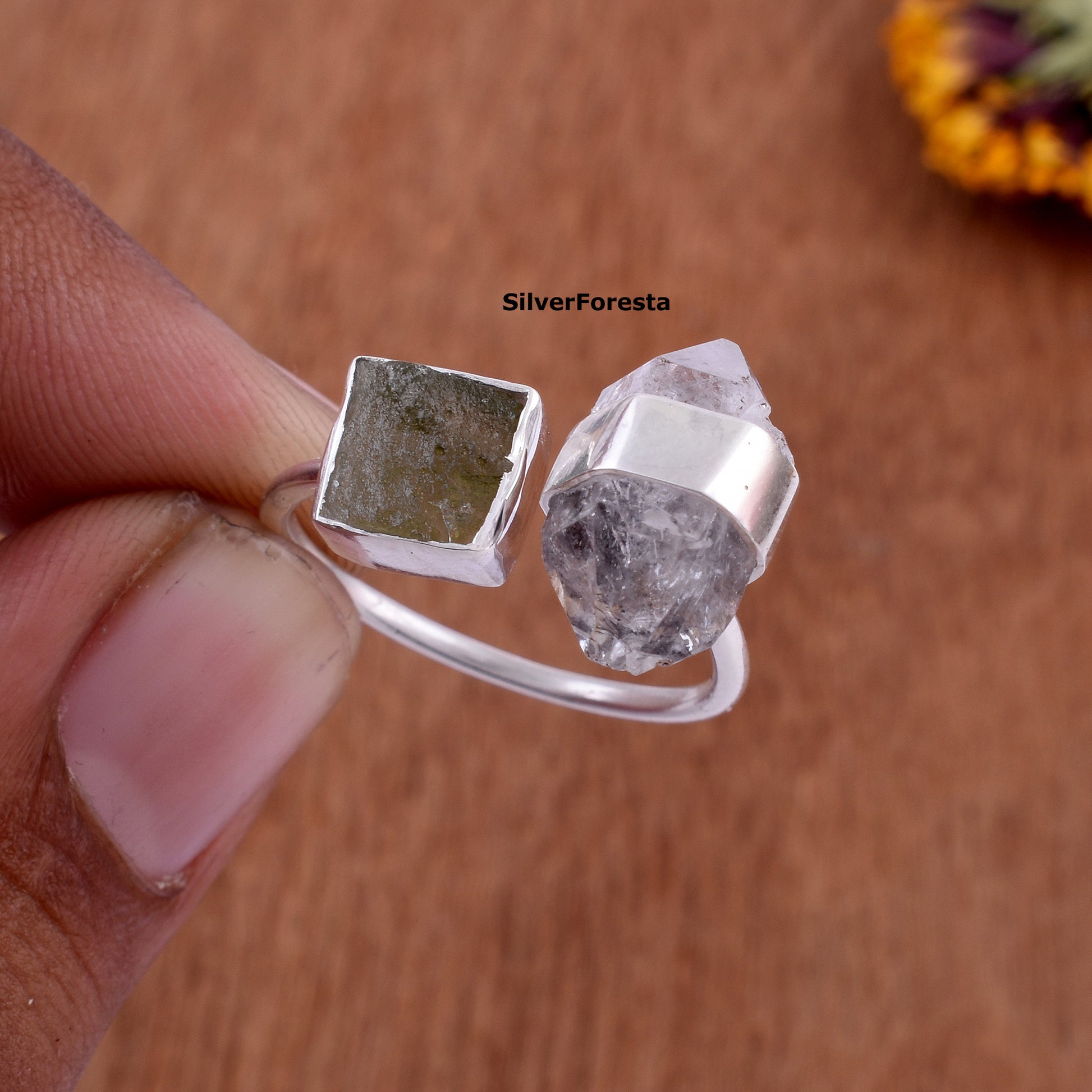 Authentic Moldavite Herkimer Diamond Ring, 925 Silver Ring, Genuine Raw Moldavite Ring, Rough Moldavite Gemstone Ring, Moldavite Jewelry.