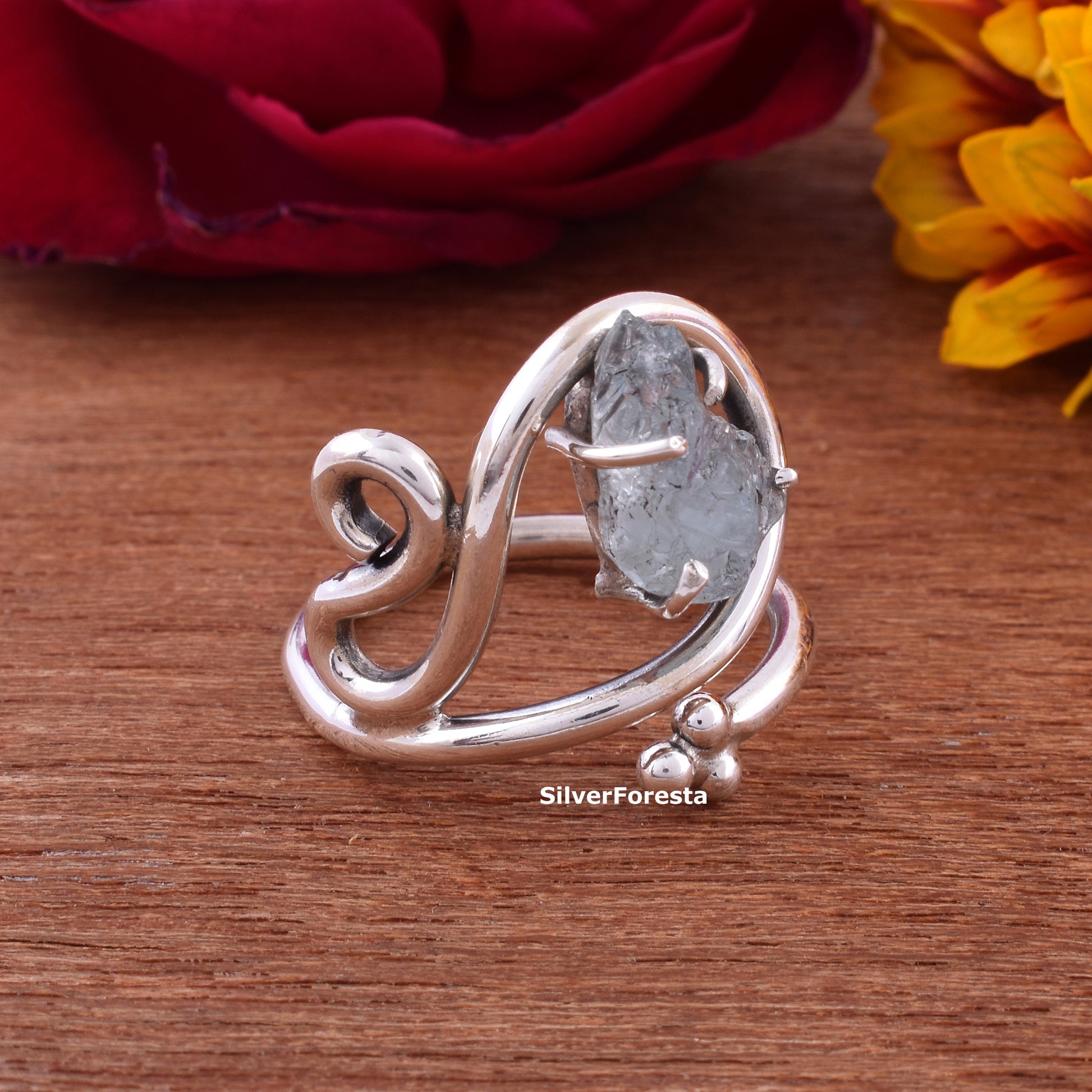 March Birthstone Ring Rough Aquamarine Silver Ring - SilverForestaa