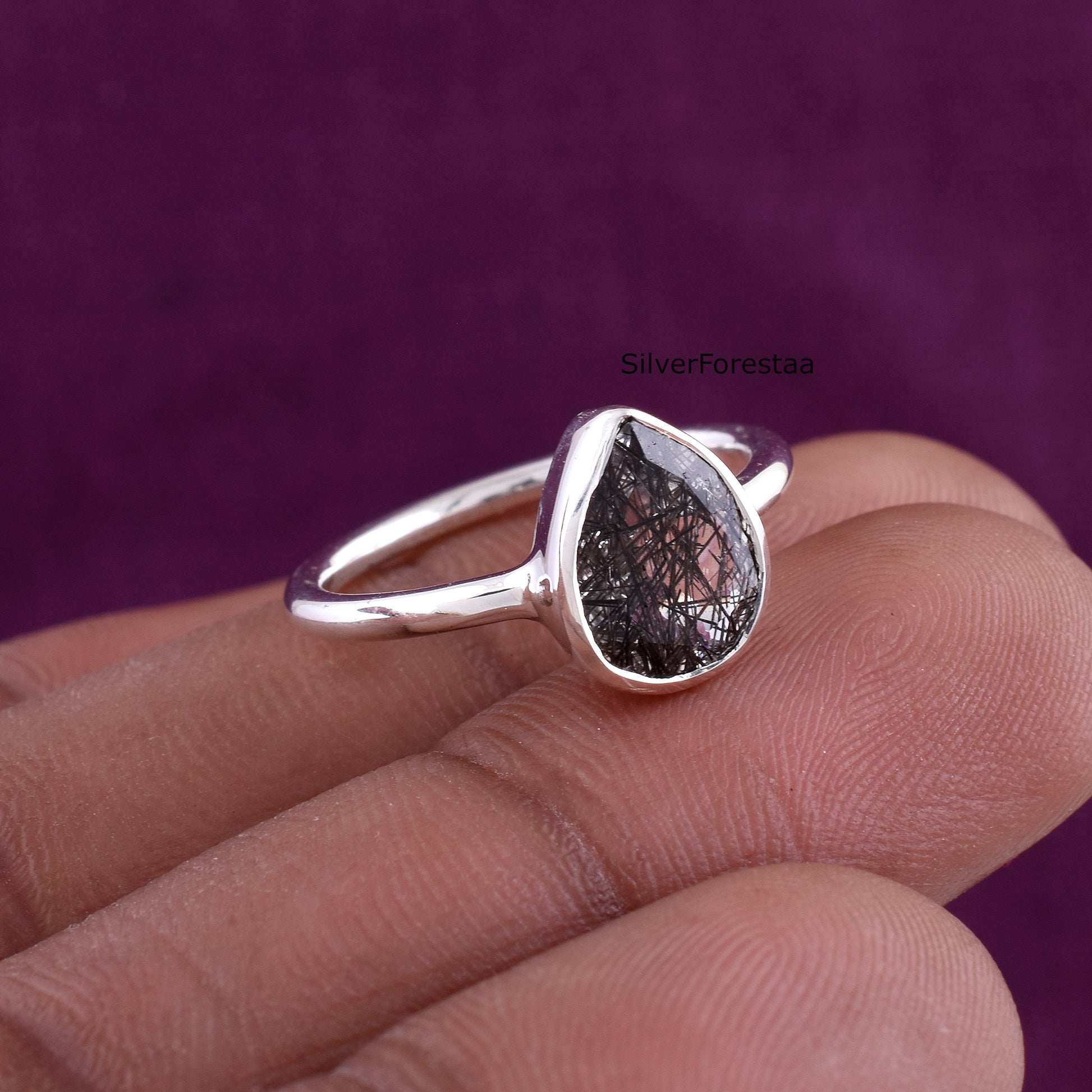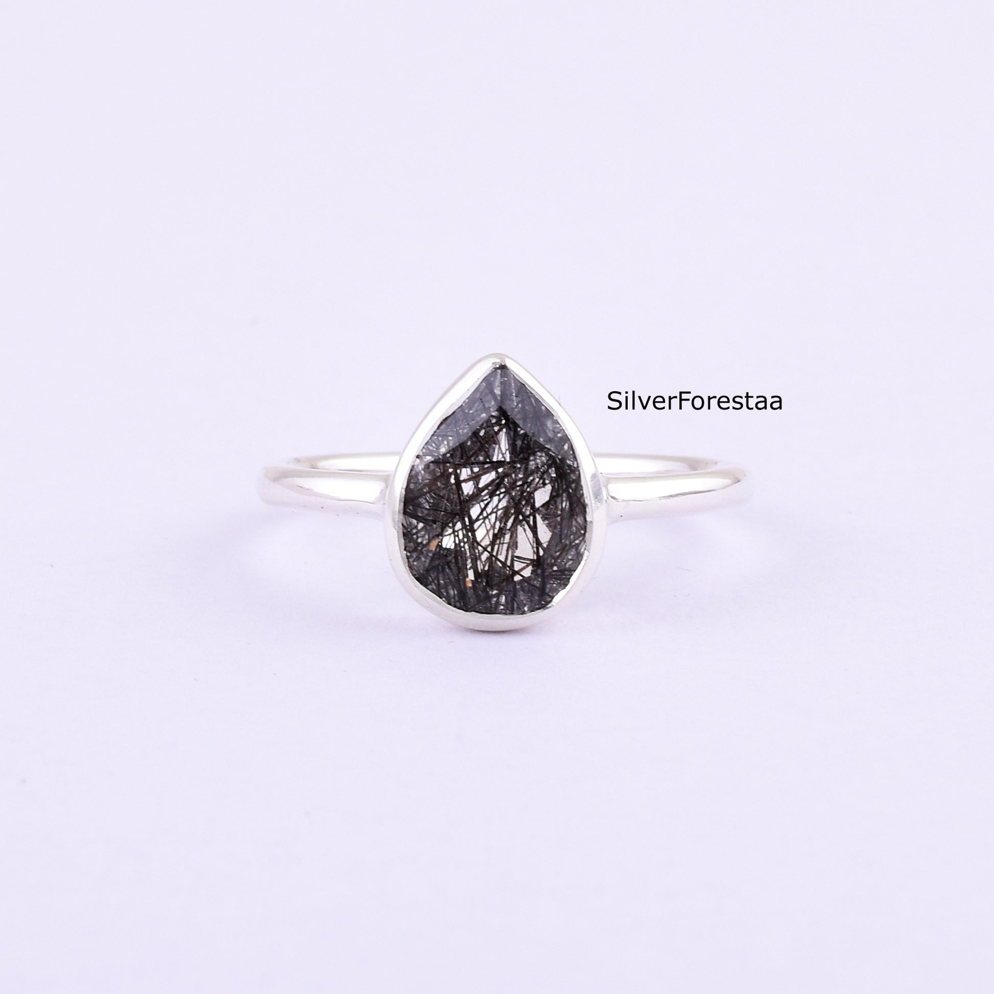 Pear Cut Black Rutile Ring, Sterling Silver Ring, Natural Black Rutile Ring, Dainty Ring, Rutile Jewelry, Handmade Ring, Gift Your Valentine