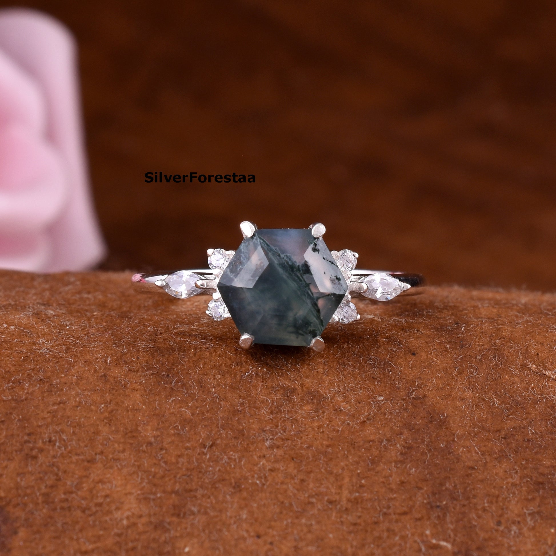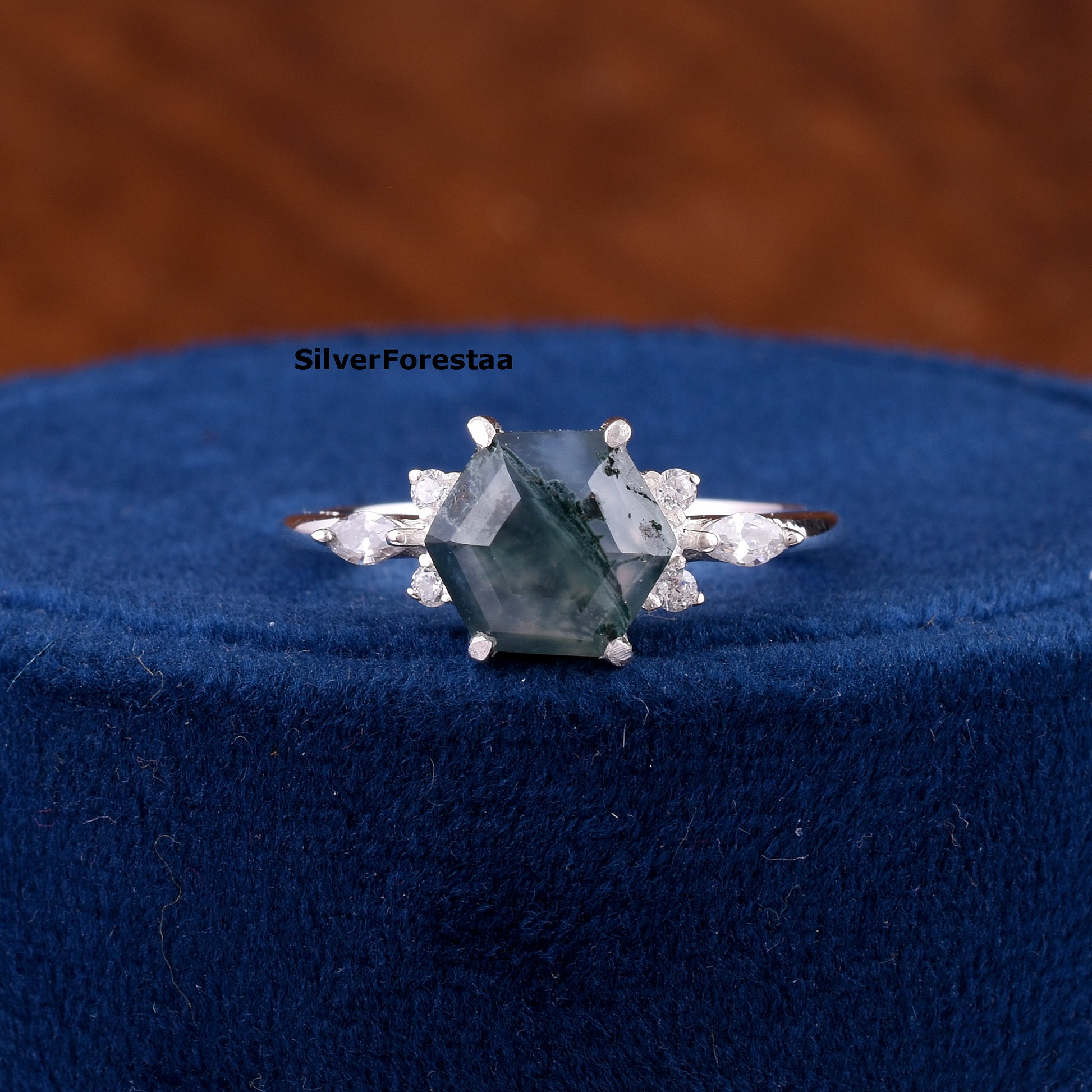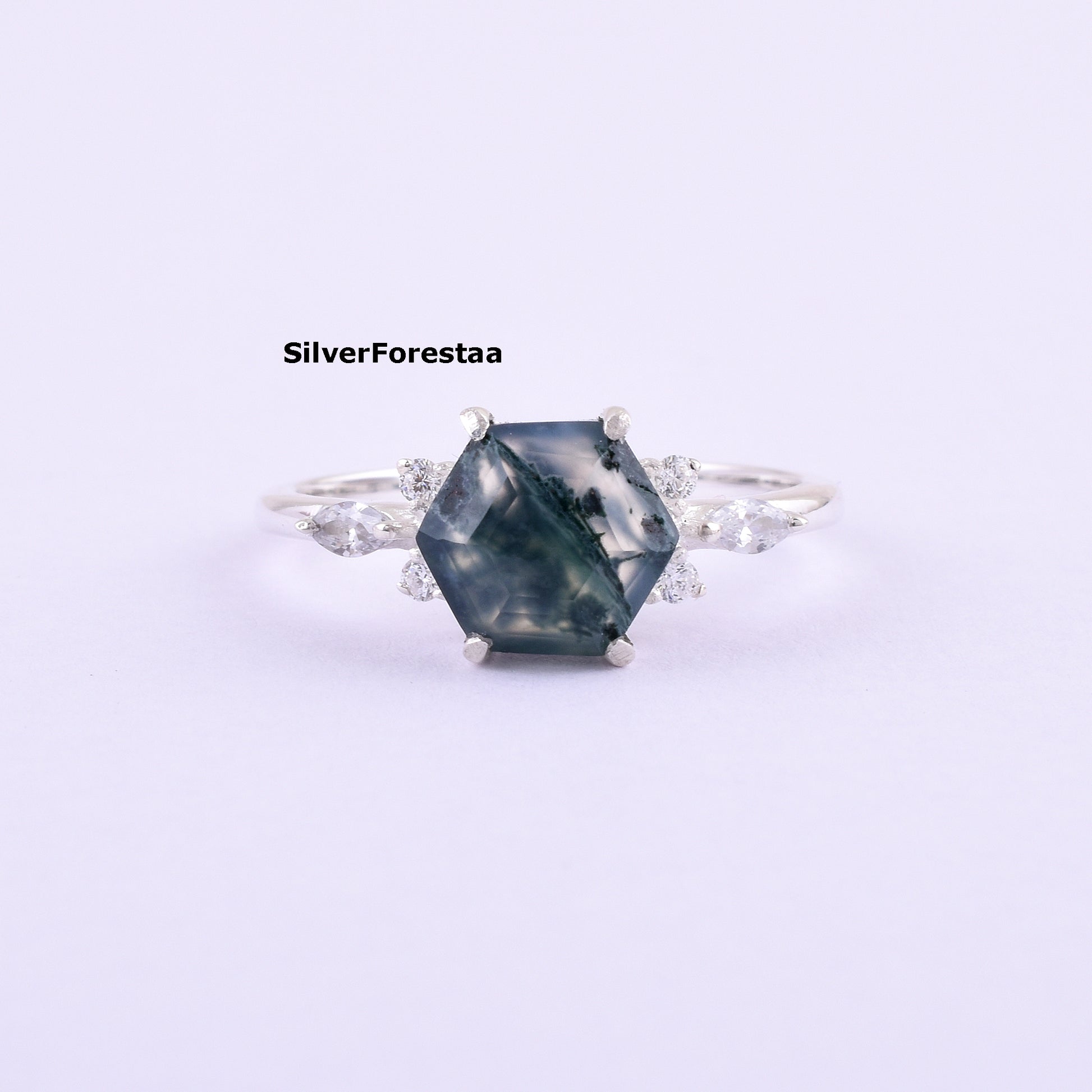 Natural Moss Agate Ring, Hexagon Shape Moss Agate Ring, 925 Sterling Silver Ring, Gemstone Ring, Moss Agate Jewelry.