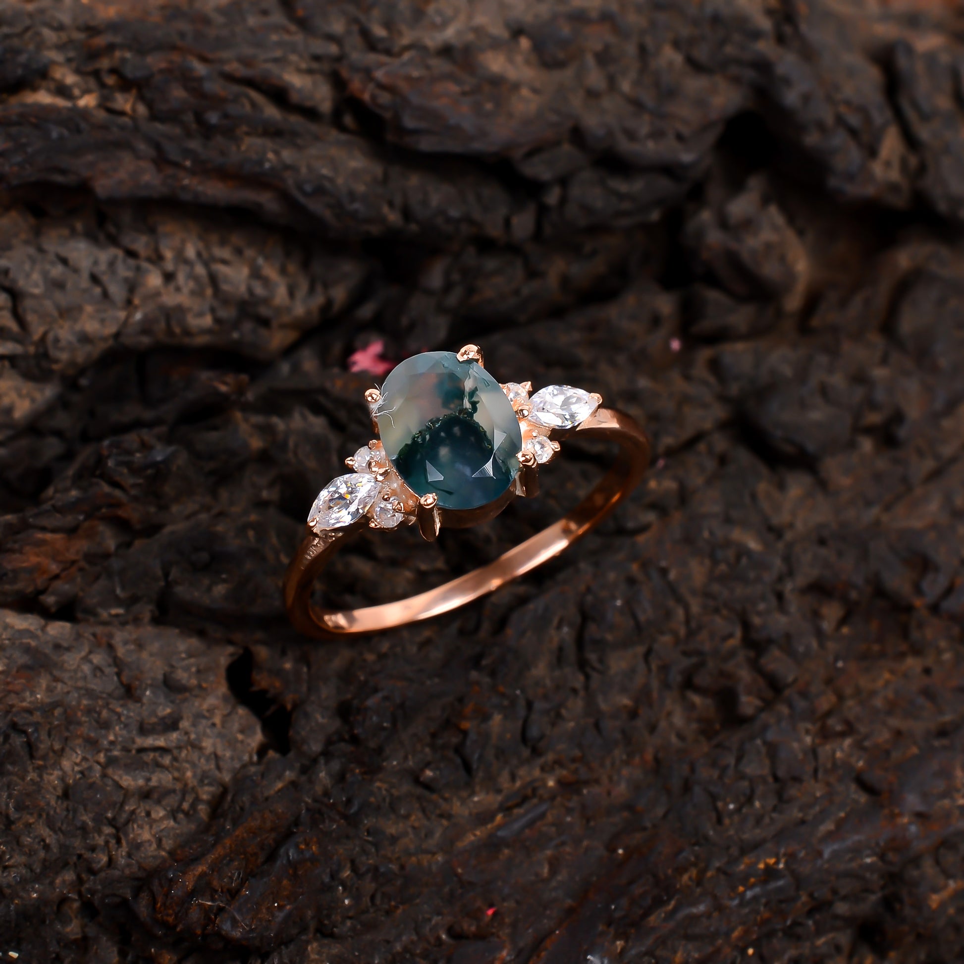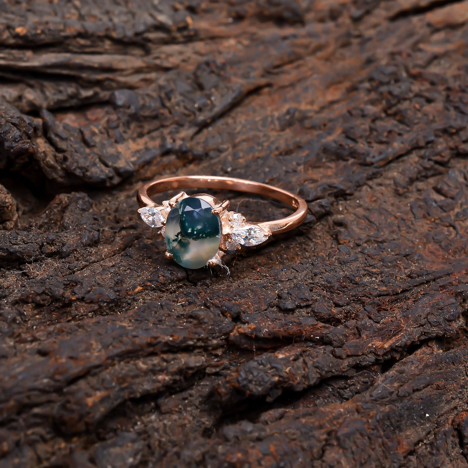 Oval Moss Agate Dainty Engagement Ring – 925 Silver