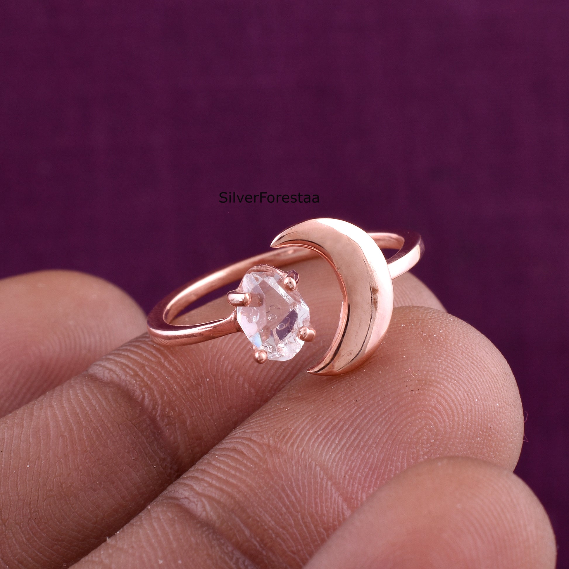 Raw Herkimer Diamond Ring, Diamond Ring, Crescent Moon Ring, 925 Sterling Silver Ring, Herkimer Ring, Rough Herkimer Jewelry, Dainty Jewelry