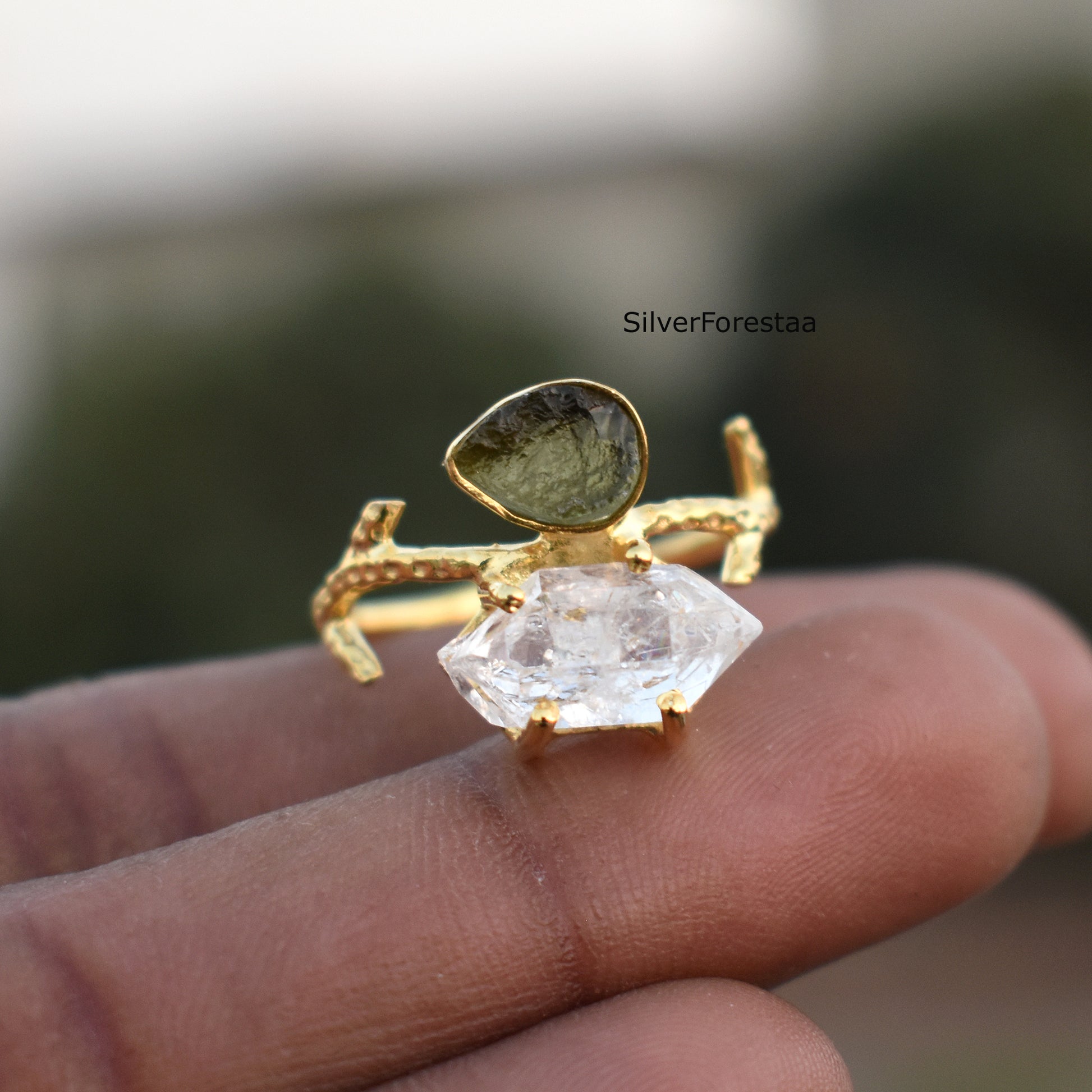 Raw Moldavite & Herkimer Diamond Silver Ring - SilverForestaa