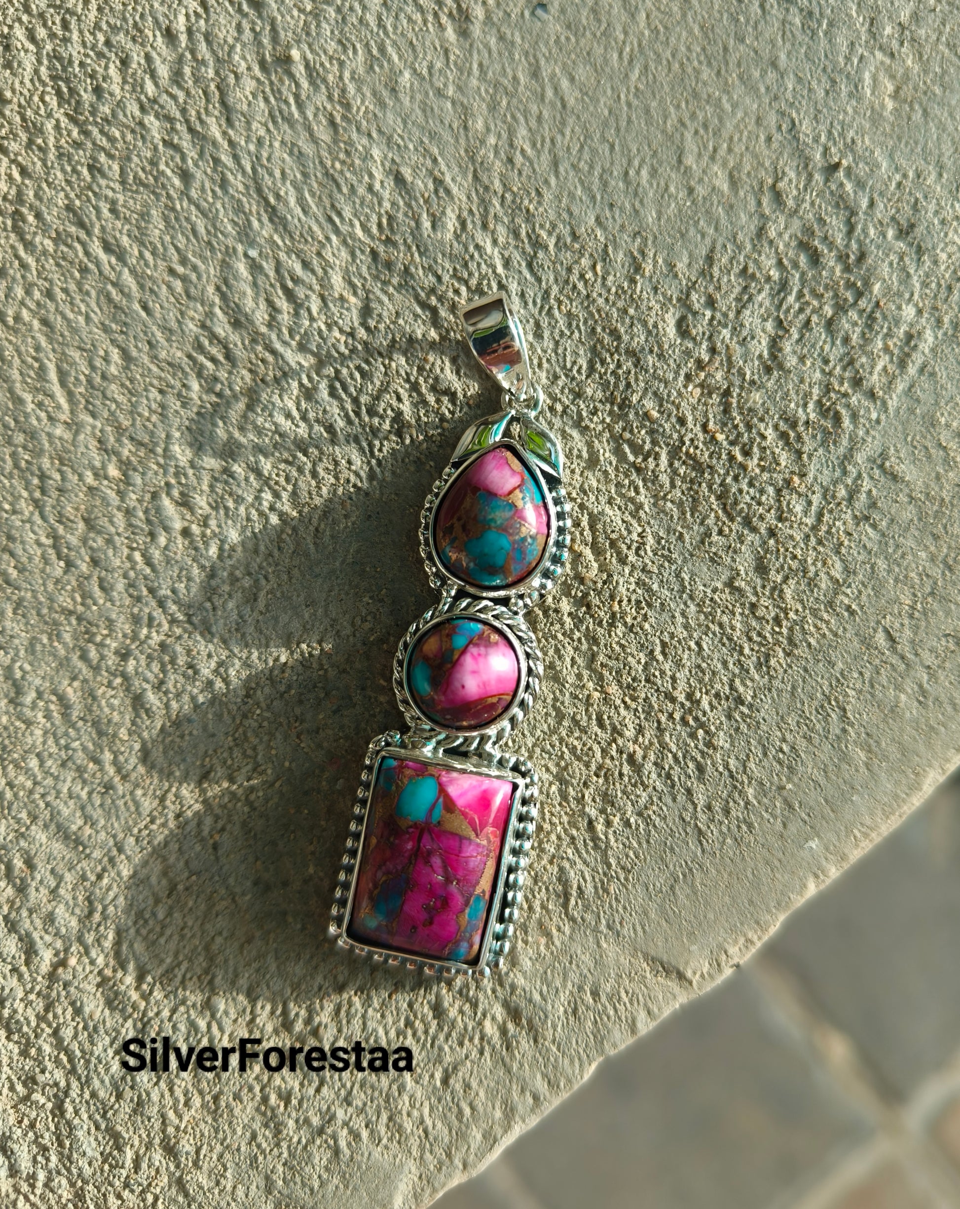Handcrafted in certified 925 silver, this pendant features an authentic Pink Kingman Turquoise gemstone known for promoting inner peace, love, and protection. Each piece from SilverForestaa is meticulously crafted by skilled artisans in India, blending traditional artistry with modern luxury. Ideal for women who appreciate fine craftsmanship and meaningful jewelry, this sterling silver pendant adds a radiant charm to both everyday wear and special occasions.