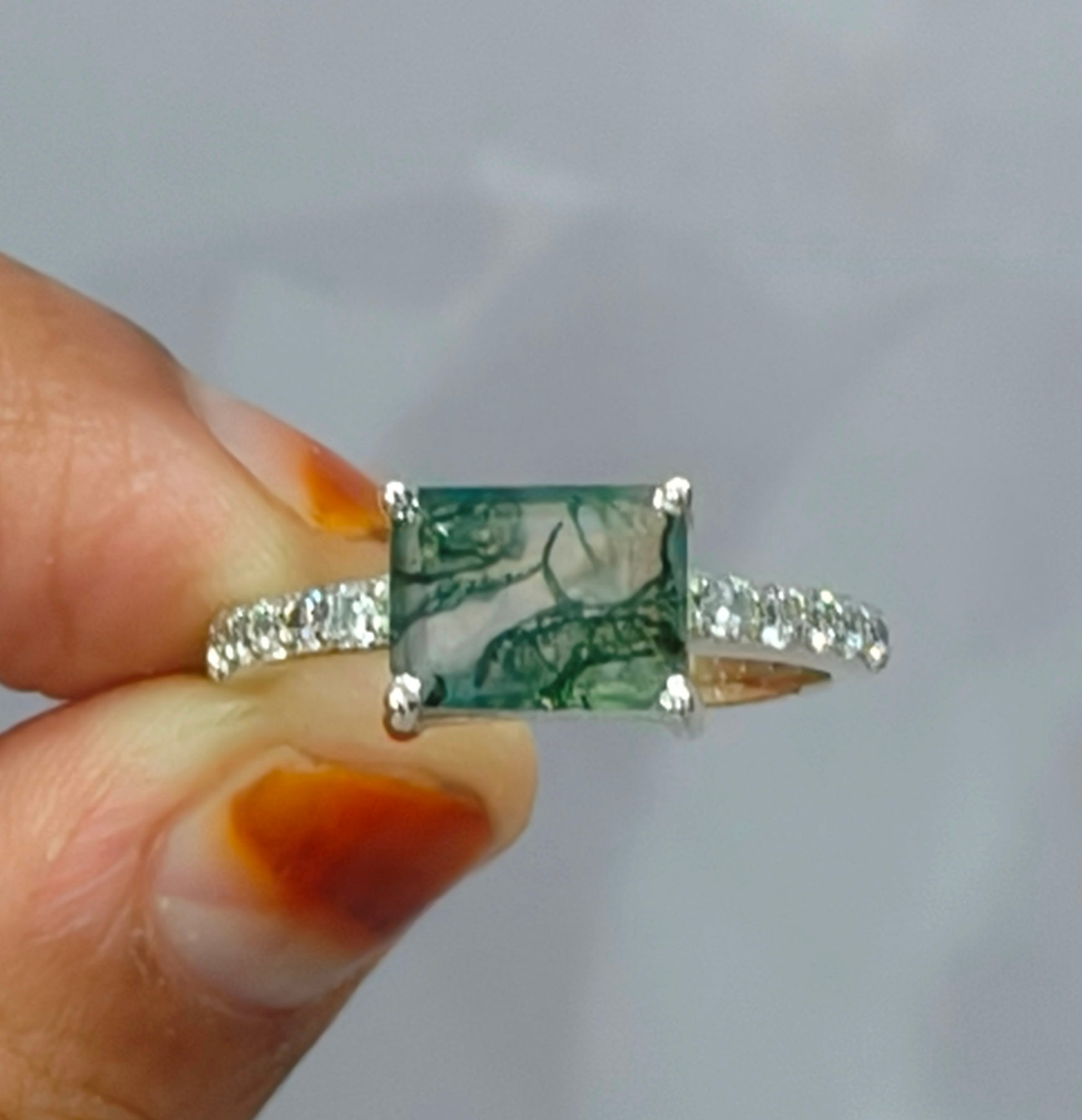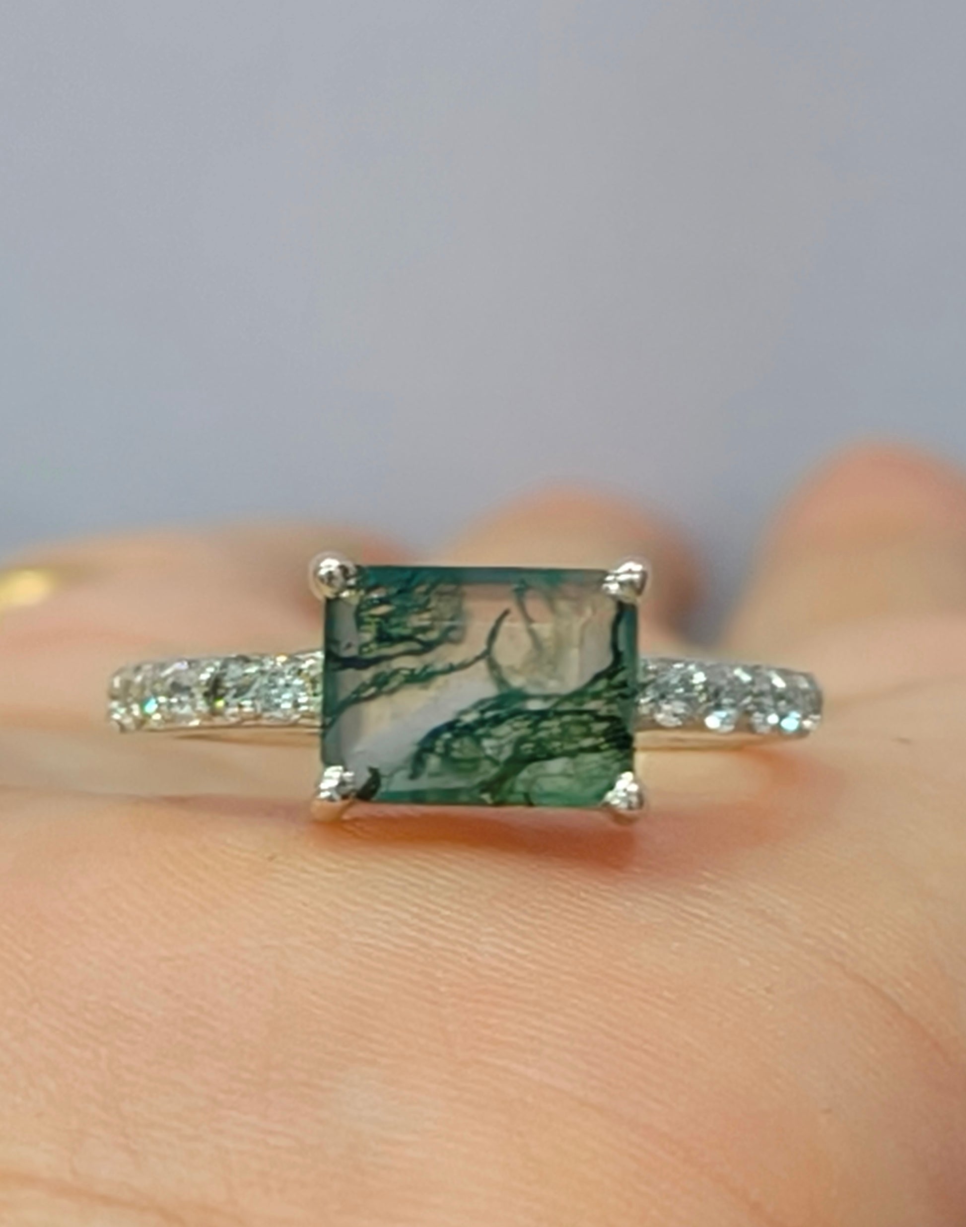 Baguette Cut Moss agate Ring 925 Sterling Silver Gemstone Ring Natural Green Moss Agate Ring Wedding Ring, Moss Agate Jewelry, Engagement Ring.