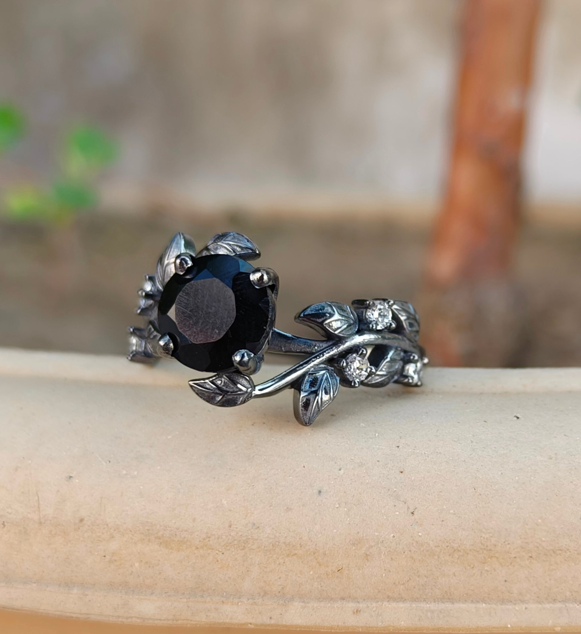 Witchy Leaf Black Onyx Ring, Round Cut Minimalist Ring, 925 Silver Ring, Black Onyx Gemstone Ring, Handmade Branches Silver Ring, Twig Ring.
